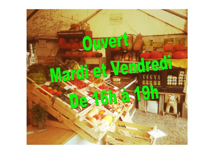 Nous vous proposons en ce moment, des pommes, des poires, des pommes de terre, des carottes, des oignons (jaunes, rouges, blancs), des salades, de la mâche, de la roquette, du poireau, du chou (Bruxelles, fleur, vert, rouge, kalé, rave), du céleri boule, des radis d’hivers (noirs longs ou ronds, des blanc, des violet), des navets, des rutabagas, des betteraves, des échalotes, des œufs, du miel (printemps, foret, sarrasin, toutes fleurs, tournesol), du jus de pomme, de la bière (blonde, blanche, brune), du pain (sur commande avant mardi soir pour le vendredi), de la farine, des biscuits, de la soupe, de la sauce tomate…Nous sommes Ouvert le MARDI et le VENDREDI de 16H à 18Hen période de couvre-feu.