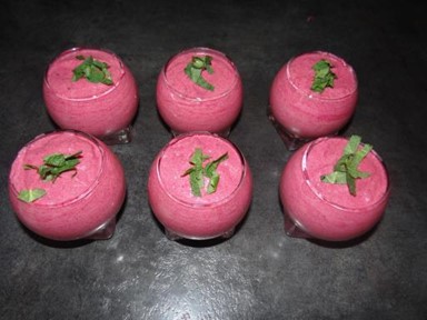 2. Le jour même, placer la betterave, le crabe, le mascarpone, le fromage blanc et la menthe dans un mixeur (à defaut vous pouvez utiliser un mixeur plongeant) Saler, poivrer et mixer 25 sec/vitesse moyenne.